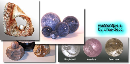 Edelsteinkugeln, wie Bergkristall, Rosenquarz, Amethyst, Sodalith usw., auch mit entsprechenden Kugelbasen oder Granit- und Schieferunterteilen verschönern jeden Brunnen und können jederzeit nachgerüstet werden. Nebst einer grossen Auswahl an verschienen Kugeln führen wir auch Springbrunnen, wasserspeiende Tiere und Figuren, Kugelbrunnen und Lochkugelbrunnen in unserem Sortiment. Schauen Sie doch ganz einfach in unserem Online-Shop oder kommen Sie mal ganz unverbindlich in unserem Geschäft in Dagmersellen vorbei. |